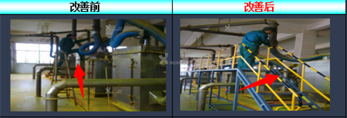 沒有平臺與護欄,員工搭人字梯操作存在安全隱患