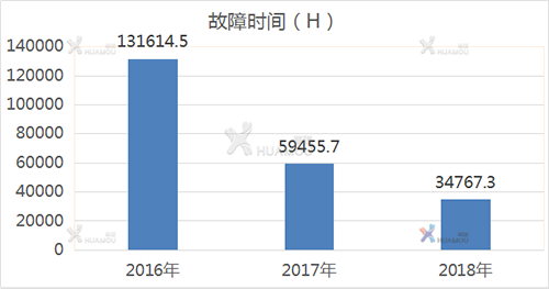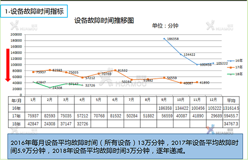 2)2016年每月設(shè)備平均故障時(shí)間(所有設(shè)備)13萬分鐘,2017年設(shè)備平均故障時(shí)間5.9萬分鐘,2018年設(shè)備平均故障時(shí)間3萬分鐘,通過2年設(shè)備管理改善降低設(shè)備故障時(shí)間77%。
