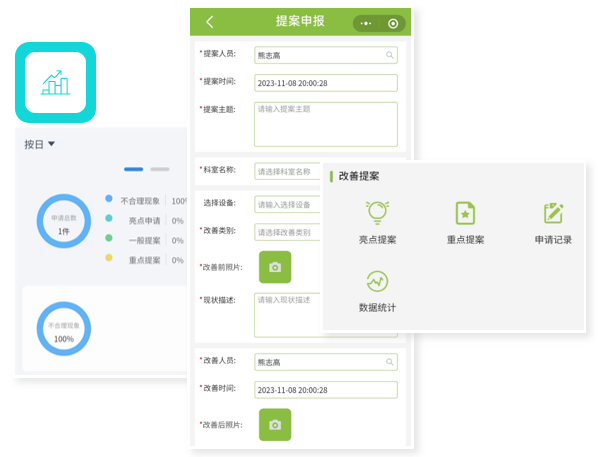 提供提案統(tǒng)計(jì)數(shù)據(jù)包括提案件數(shù)、占比、類型占比、參與率、實(shí)施率、優(yōu)秀率