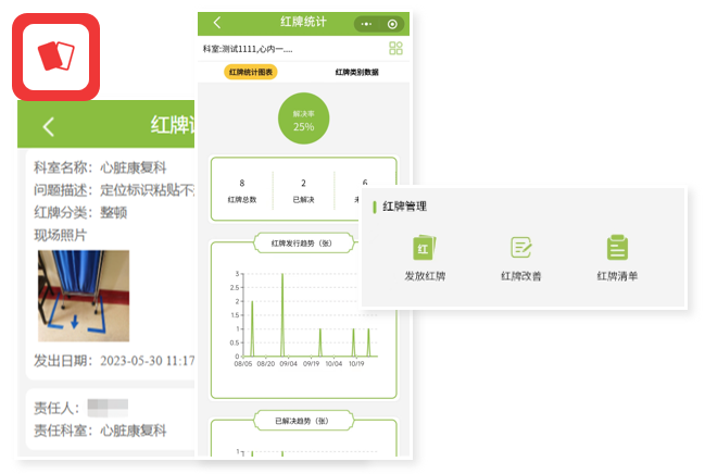 科室區(qū)域負(fù)責(zé)人自動(dòng)收到紅牌整改工單,整改完成在線上提交整改結(jié)果和線上驗(yàn)收,實(shí)時(shí)更新整改狀態(tài)