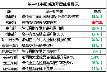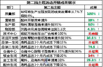 6)從各車間選定3條樣板線效率改善,其中總裝一、總裝二全部達(dá)標(biāo),配件車間庫存下降50%;