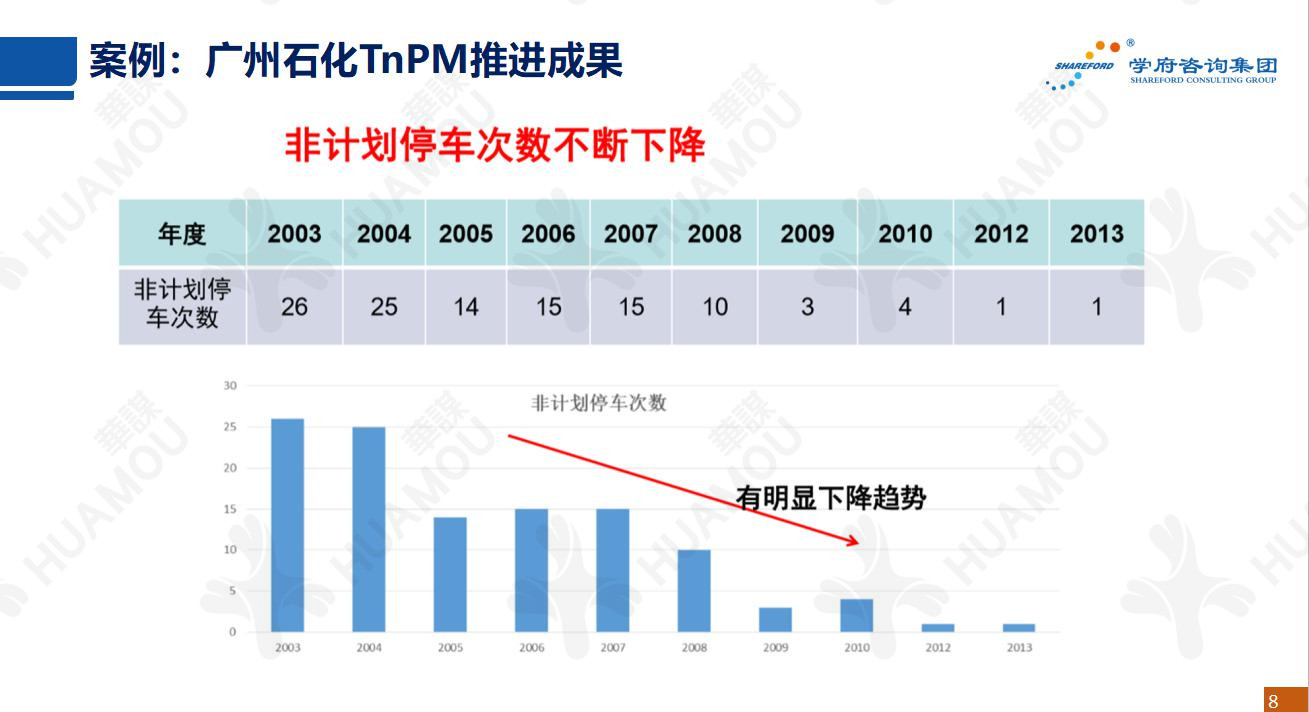 石化從2003年開(kāi)始導(dǎo)入TnPM中的“6S”管理,以規(guī)范和強(qiáng)化現(xiàn)場(chǎng),從2004年3月全面導(dǎo)入TnPM。根據(jù)石化工業(yè)特點(diǎn),創(chuàng)造、建立廣石化 TnPM檢查評(píng)價(jià)體系,使體系更加適合石化系統(tǒng)。通過(guò)不斷實(shí)踐與創(chuàng)新,設(shè)備管理水平總體上取得進(jìn)步。裝置實(shí)現(xiàn)長(zhǎng)周期運(yùn)行,設(shè)備故障率、非計(jì)劃停車(chē)次數(shù)逐年降低;生產(chǎn)裝置大修周期從之前的一年一修全面實(shí)現(xiàn)了四年一修。